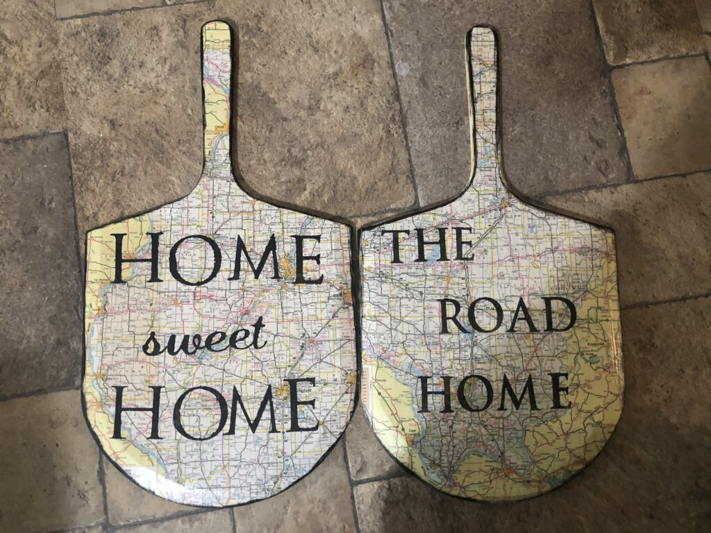 So, I finally get hubby to go live with me, and we made “poop” signs and pizza paddles with maps and stencils on them!