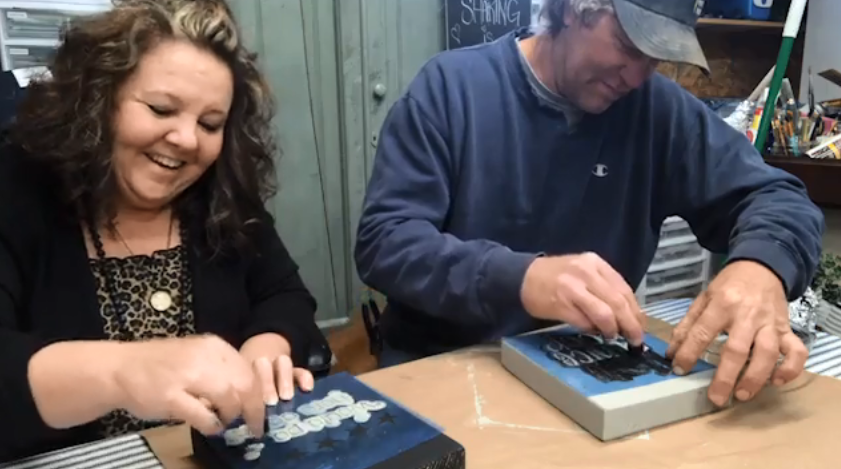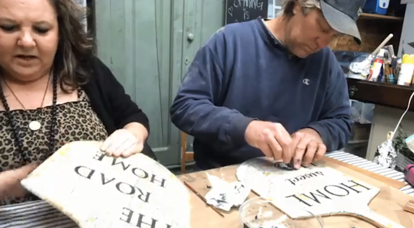 Then we stenciled sayings on. Greg’s saying was “Home Sweet Home,” and mine ended up being “The Road Home.” I had wanted to do a longer saying, but it became evident rather quickly that my original saying “the world needs who you were meant to be” was not going to fit! So I asked the viewers to give me a smaller saying, and that was what we settled on!